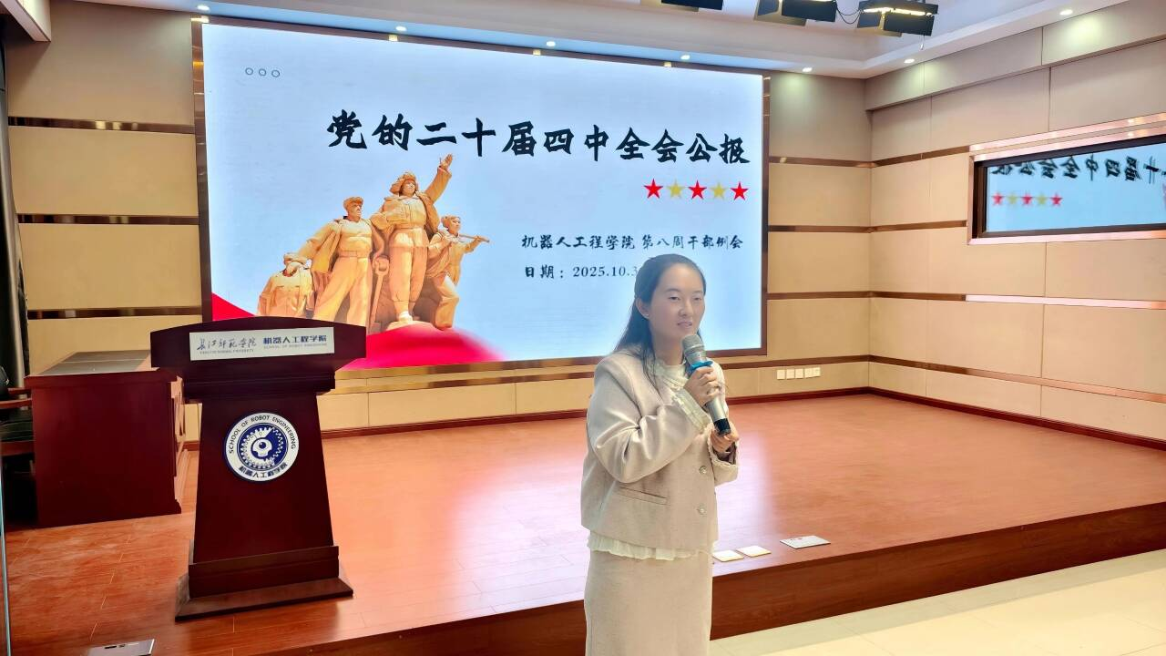为深入学习宣传贯彻党的二十届四中全会精神,进一步增强学生干部的理论素养与使命担当,10月30日中午,机器人工程学院在至定北楼206会议室召开学生干部专题学习会议。会议由学院团委副书记、学工办副主任陈婷婷老师主讲,全体学生干部参加。
