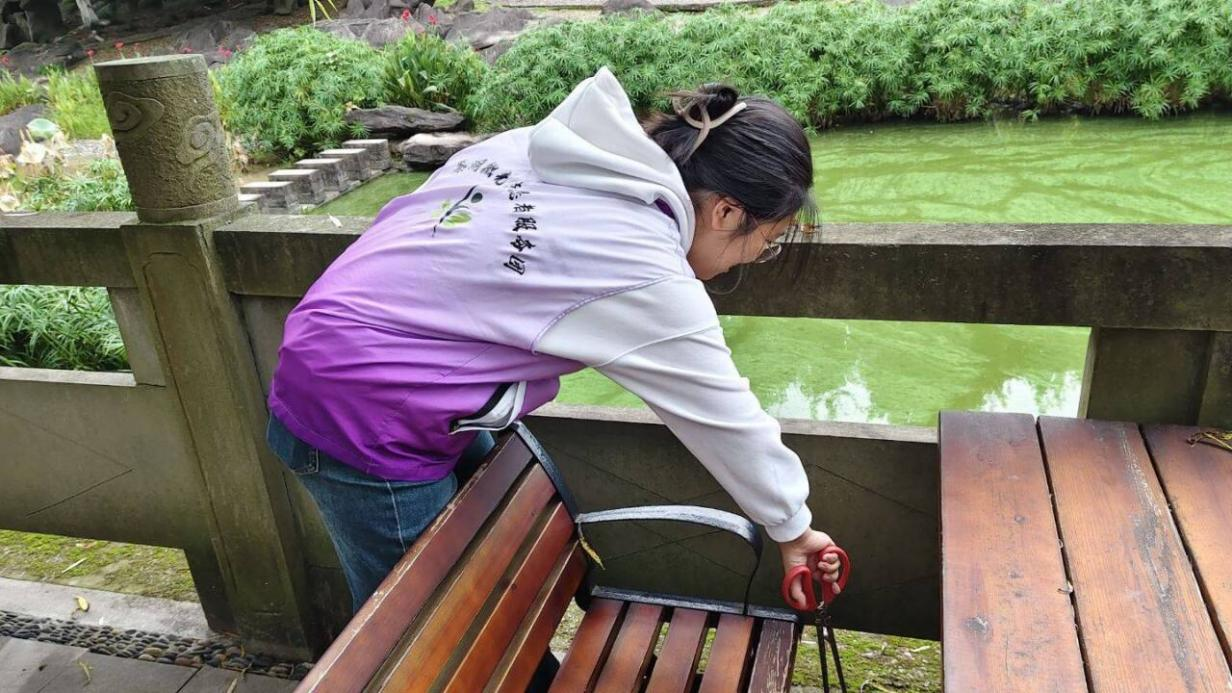 活动中,志愿者们身着统一的紫色志愿马甲,手持扫帚、垃圾夹和簸箕等清洁工具,分工协作、细致清理了鉴湖周边的木栈道、草丛、石堆及长椅等重点区域。他们不放过任何一处卫生死角——从木栈道缝隙中的碎屑,到草丛深处隐藏的包装袋,再到石堆间的杂物,都被一一清理出来,并分类装入垃圾袋。志愿者们以实际行动还原了鉴湖的整洁面貌,也希望通过自身的实践号召更多人养成爱护环境的良好习惯,共同守护城市的生态空间。