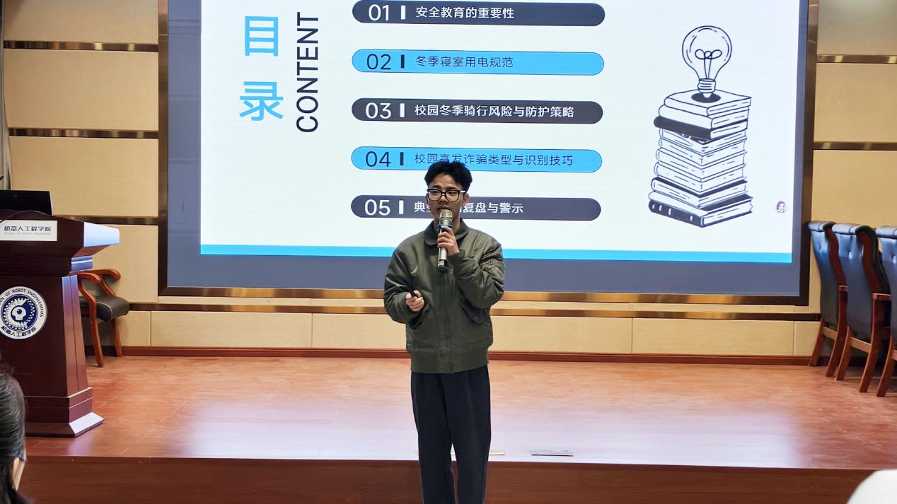 为切实增强全院师生的安全防范意识,有效预防冬季校园安全事故与电信网络诈骗案件发生,2025年12月17日,机器人工程学院于至定北楼206会议室开展安全教育专题讲座。由社区管理部副部长李世轩担任主讲人。