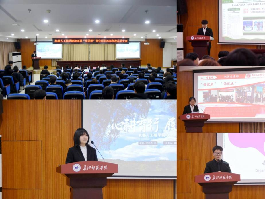 为全面复盘2025年度团学工作的开展情况,明晰下一阶段的发展规划,2025年12月29日晚,机器人工程学院于鉴湖微光报告厅开展2025年度“党团学”学生组织总结大会。学院团委副书记、学工办副主任陈婷婷,2024级辅导员高红平、2022级辅导员杨成艺,以及主席团成员出席本次会议。