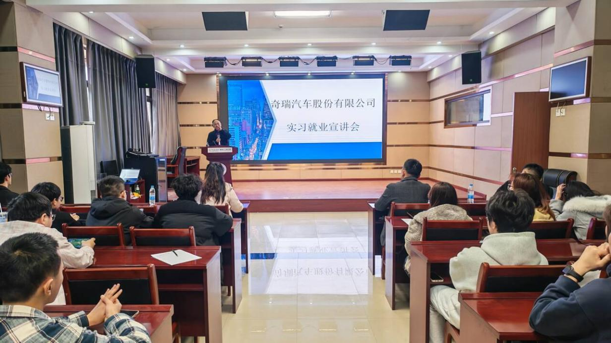 2026年3月24日,机器人工程学院在至定北楼206会议室举办奇瑞汽车股份有限公司实习就业宣讲会。本次宣讲会特邀校友曹亮、奇瑞汽车股份有限公司人事专员刘君君担任主讲,学院团委副书记、学工办副主任陈婷婷老师主持。