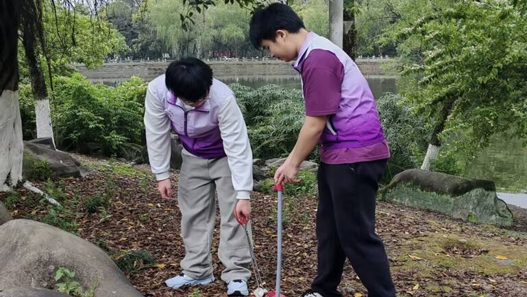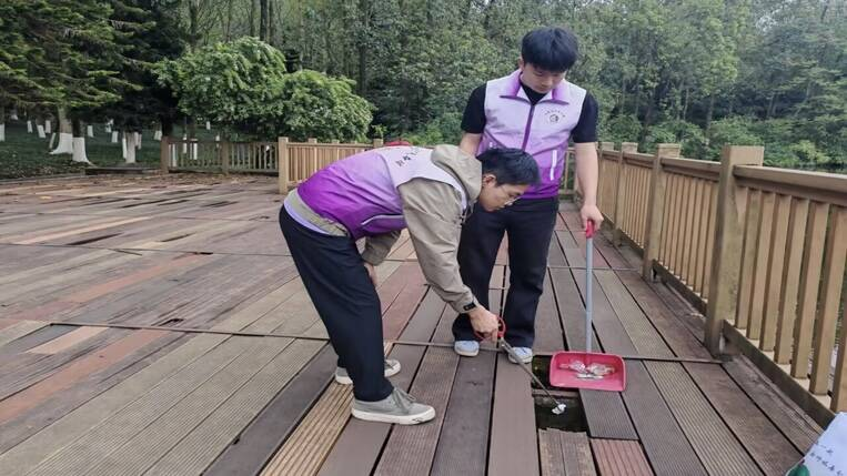 活动当天,志愿者们携带扫帚、垃圾夹、等工具,准时集结前往鉴湖沿岸。大家迅速完成分组分工,沿着湖边步道、绿化带及临水木栈道展开清理。面对藏匿在石缝、草丛与木板间隙中的纸巾、塑料袋、烟蒂等垃圾,志愿者们弯腰俯身,仔细捡拾并分类收纳,不放过任何一处卫生死角。